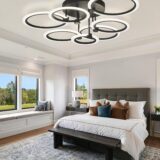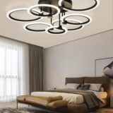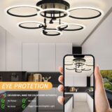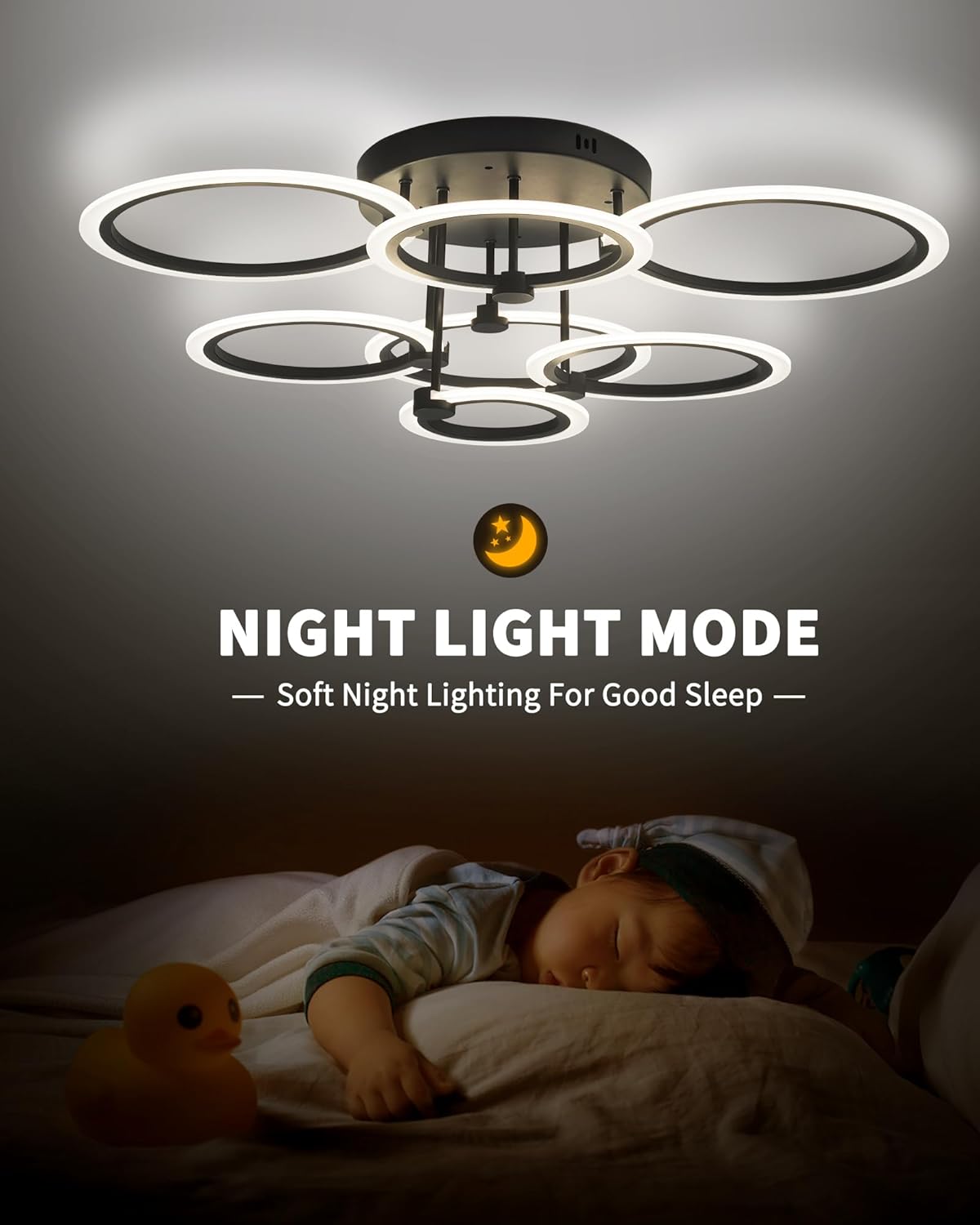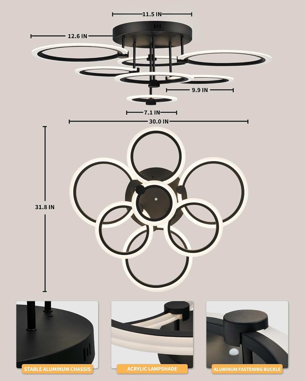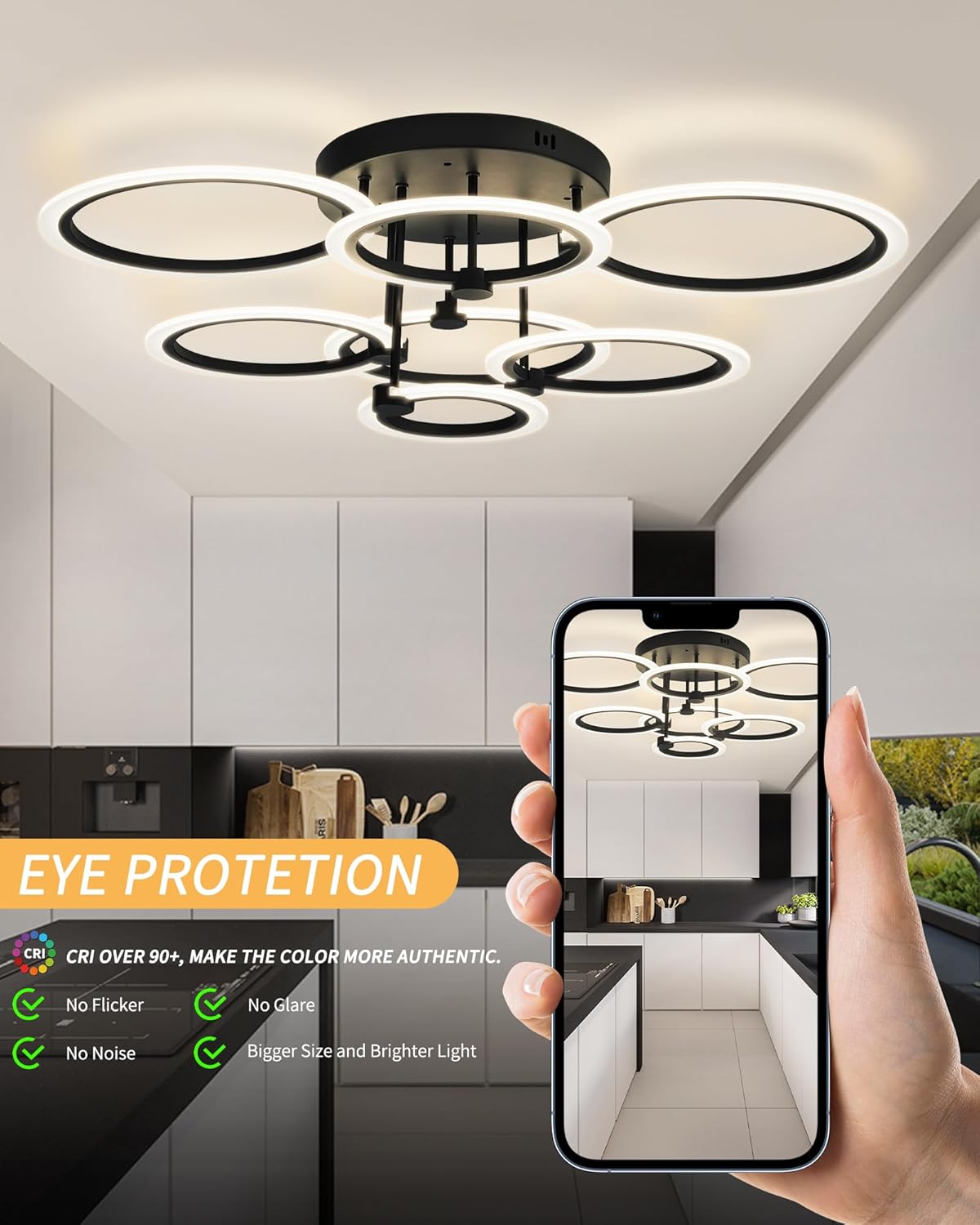 Illuminate your space with the Modern LED Ceiling Light featuring an innovative design of 7 rings that adds a touch of elegance to any room. This dimmable fixture comes with a convenient remote control, allowing you to effortlessly adjust the brightness and color temperature from 3000K to 6500K, catering to your mood and needs. With a generous size of 31.8 inches and a powerful 130W output, this flush mount ceiling lamp is perfect for your living room, bedroom, or kitchen. The sleek black finish complements modern decor while providing ample lighting for any occasion. Upgrade your home lighting with this stylish and functional ceiling light that combines contemporary aesthetics with advanced technology.